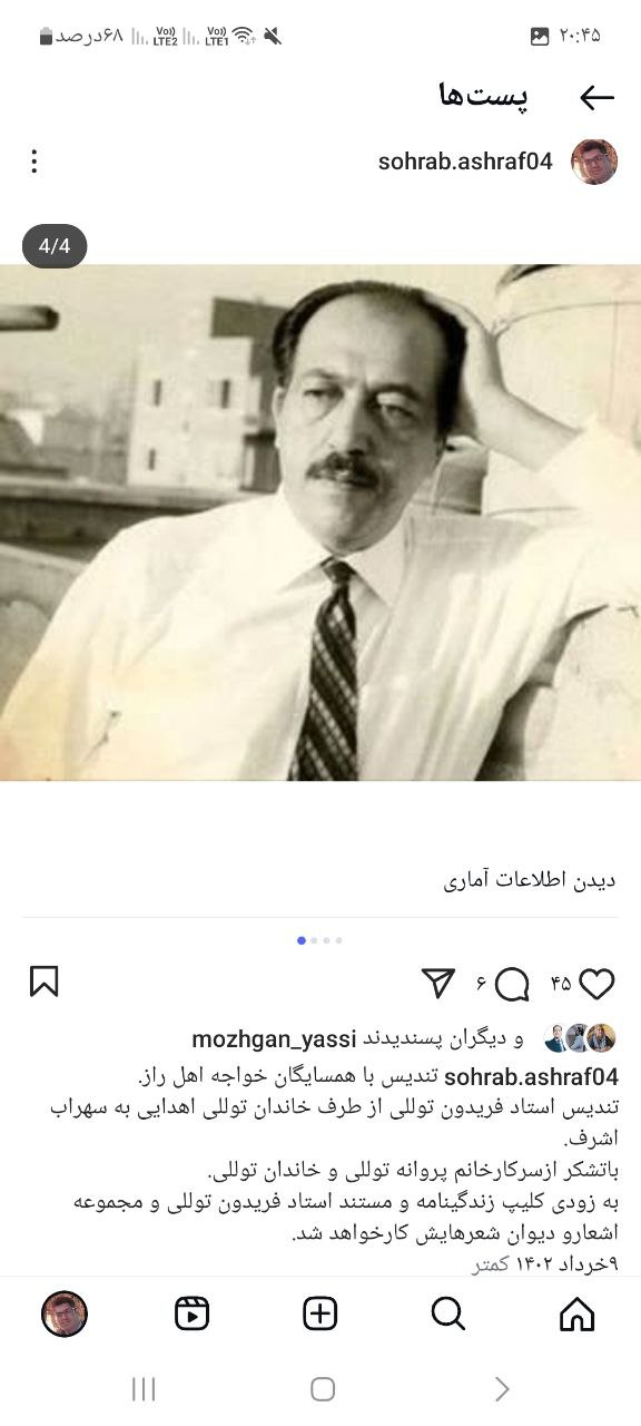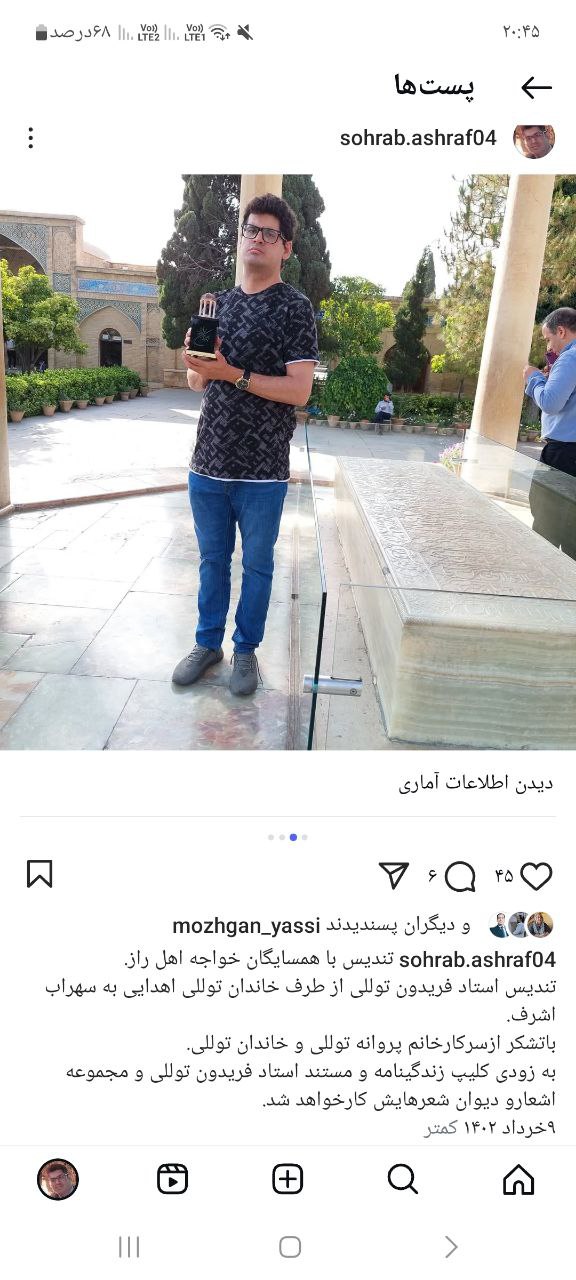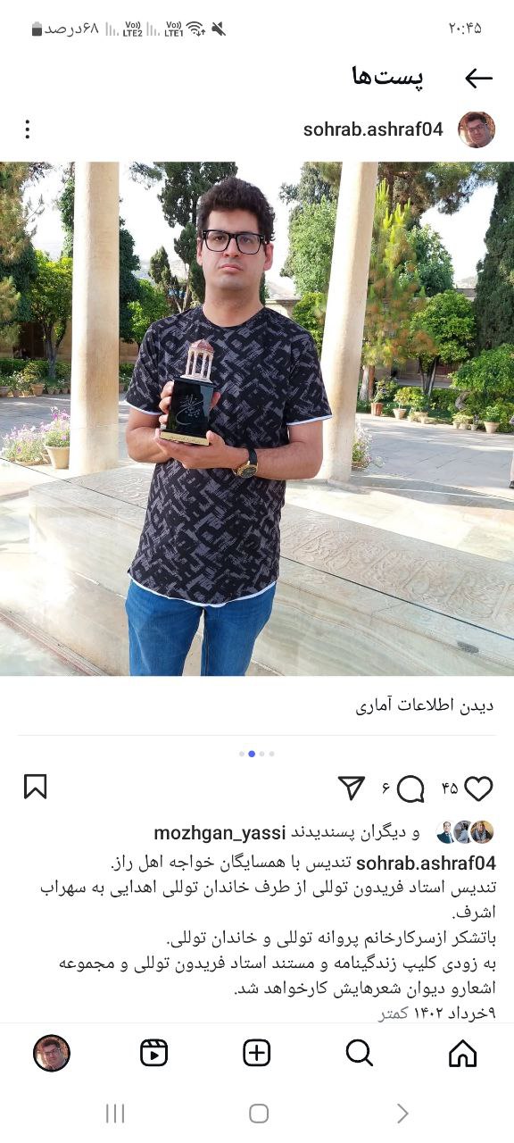 فیلم کوتاه تولدی دیگر کارگردانان سهراب اشرف و علیرضا اسدی و نویسنده و تهیه کننده و طراح صحنه سهراب اشرف سال تولید مهرماه 1401 اکران شده در هفته فیلم حافظ بردن یک تندیس و لوح تقدیر دریافت از آقای ابراهیم شیشه گر مهرماه 1402.اکران مهر ماه 1402.