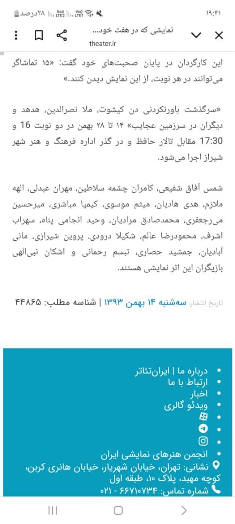 نمایش کنار شیر آتش نشانی کارگردان ناصر بزرگزاده ارباب به عنوان پایان نامه۹۴/۳/۱۱مدیر صحنه سهراب اشرف پلاتو یک