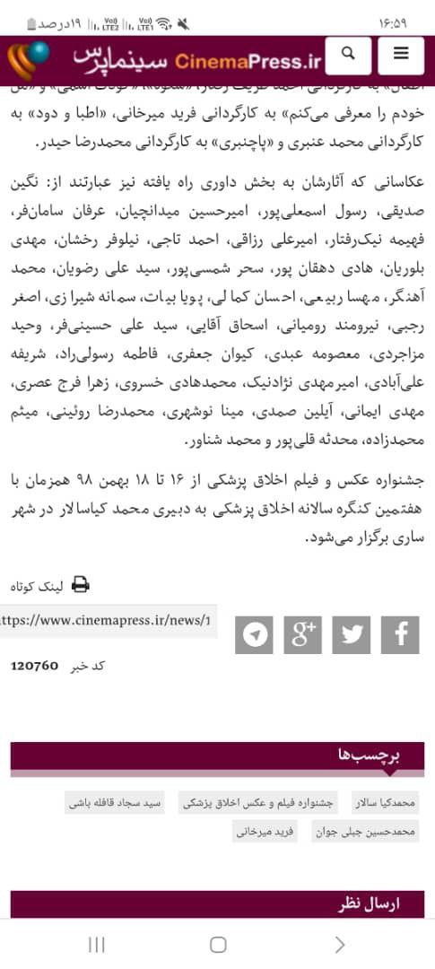فیلم کوتاه داستانی پابوس ص 1999کارگردان سید ابراهیم حسینی سمت به عنوان عکاس منتخب 16جشنواره بین المللی فیلم مقاومت لیست پخش از تلویزیون 7اردیبهشت 1404شبکه فارس، 9آذر 1401شبکه کیش، 16دی 1401شبکه کرمان 7آبان 1401شبکه فارس،
